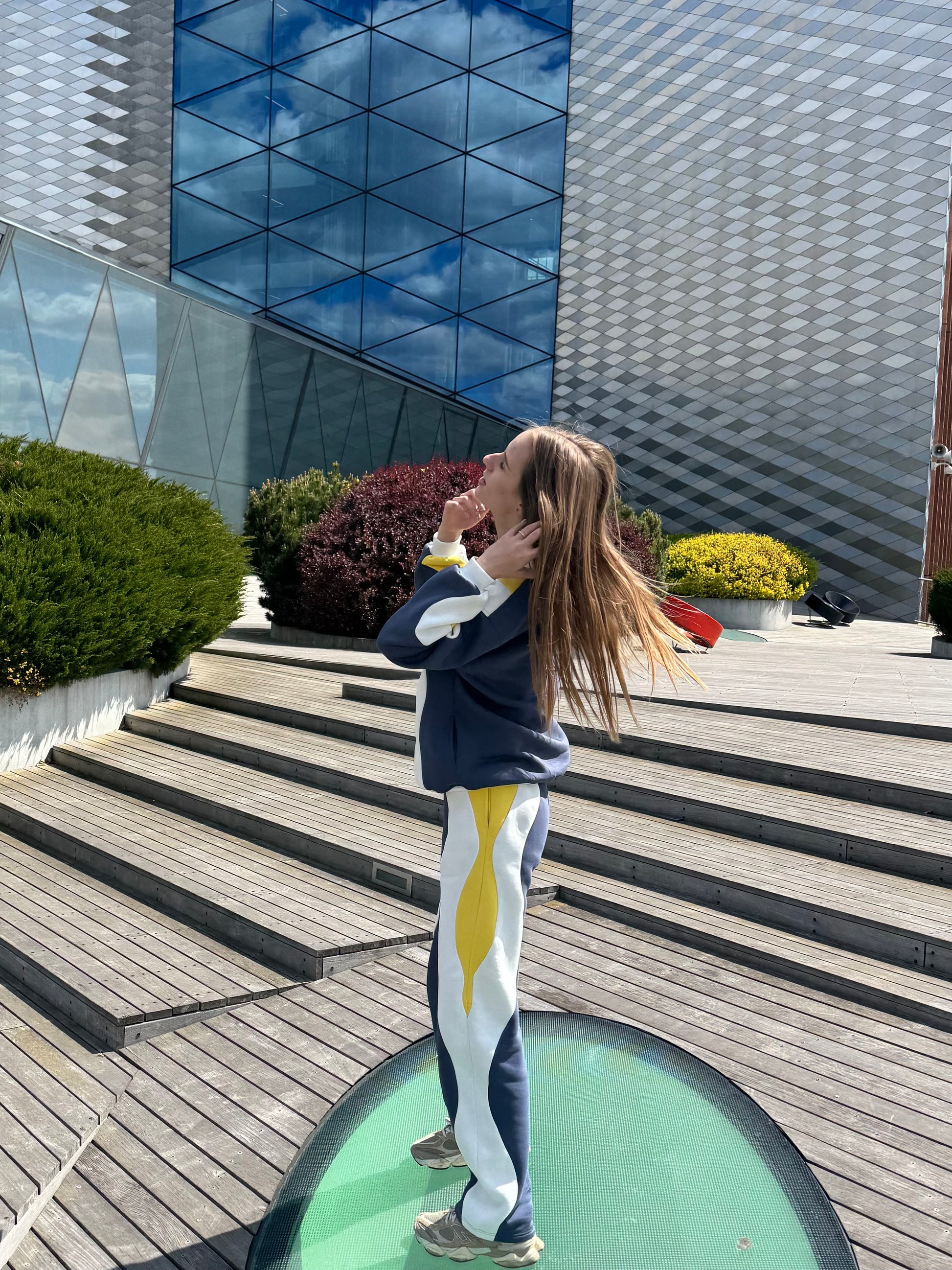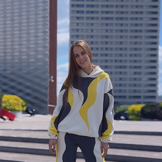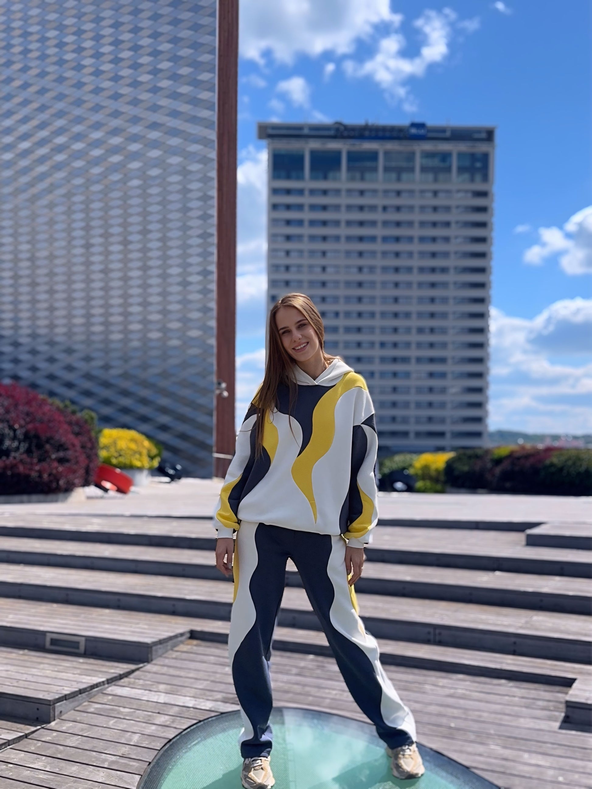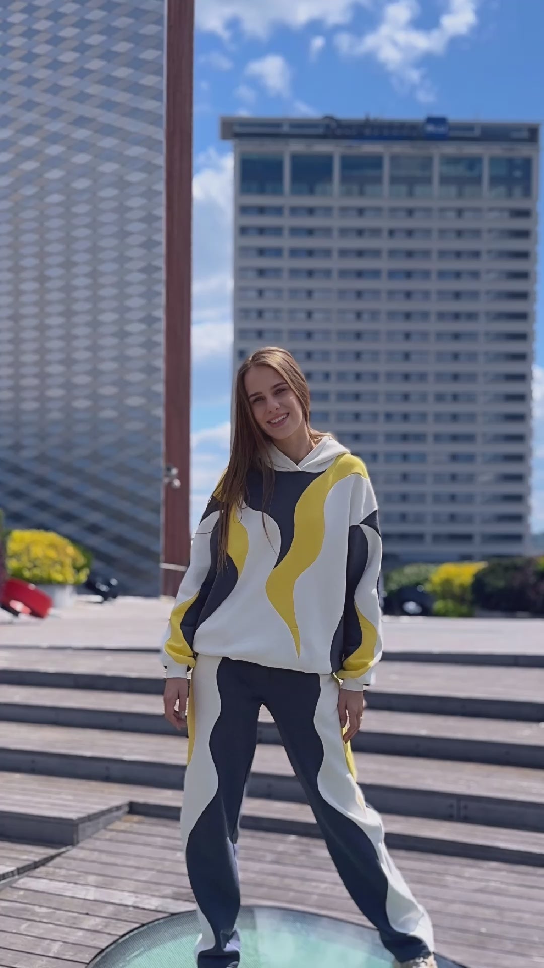 Jei ieškai išskirtinio ir energija trykštančio derinio – šis kostiumėlis kaip tik tau! Džemperis ir kelnės su banguotais raštais – tarsi gyvas judesys audinyje 🌪️. Tobulas pasirinkimas tiek aktyvioms dienoms, tiek stilingam poilsiui 🧘🌞