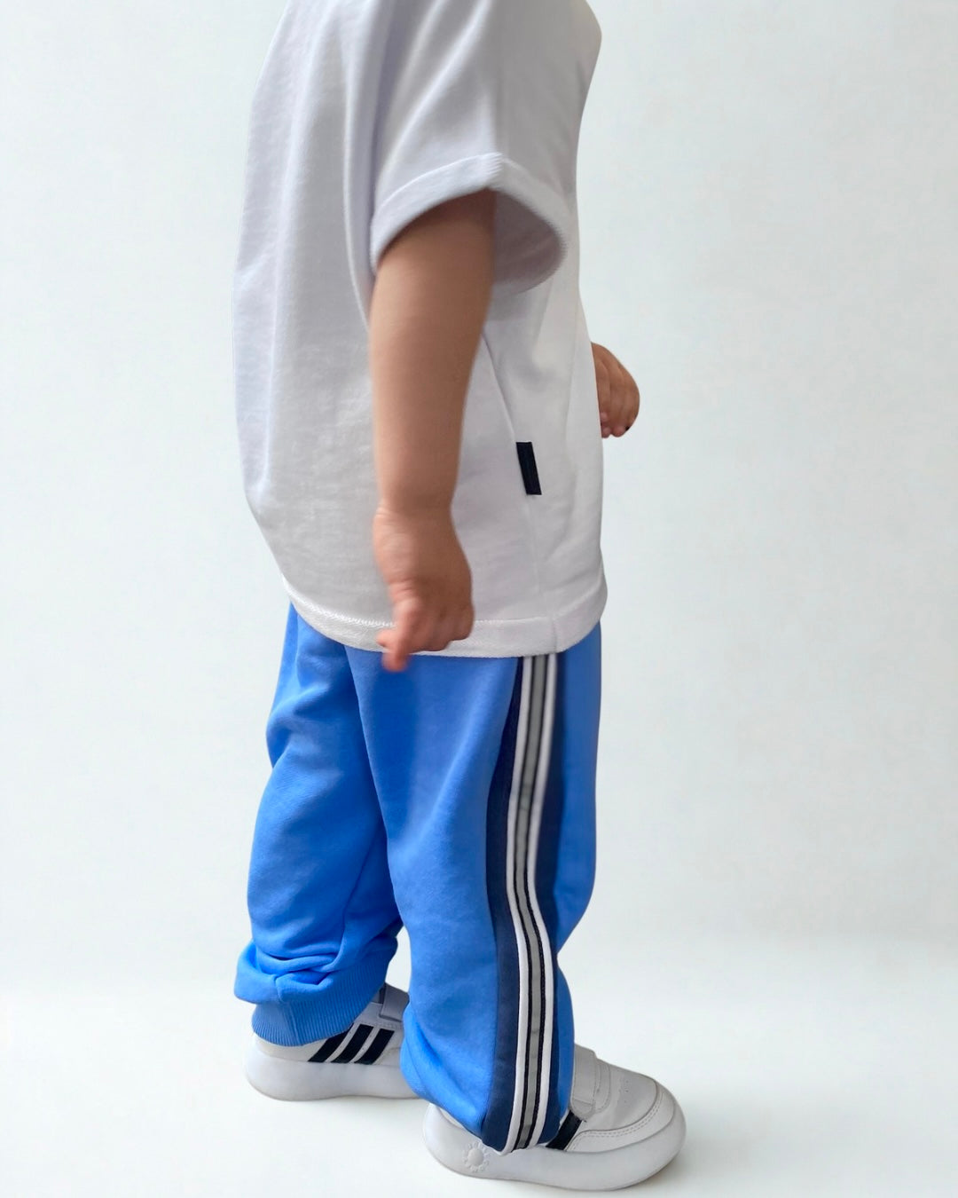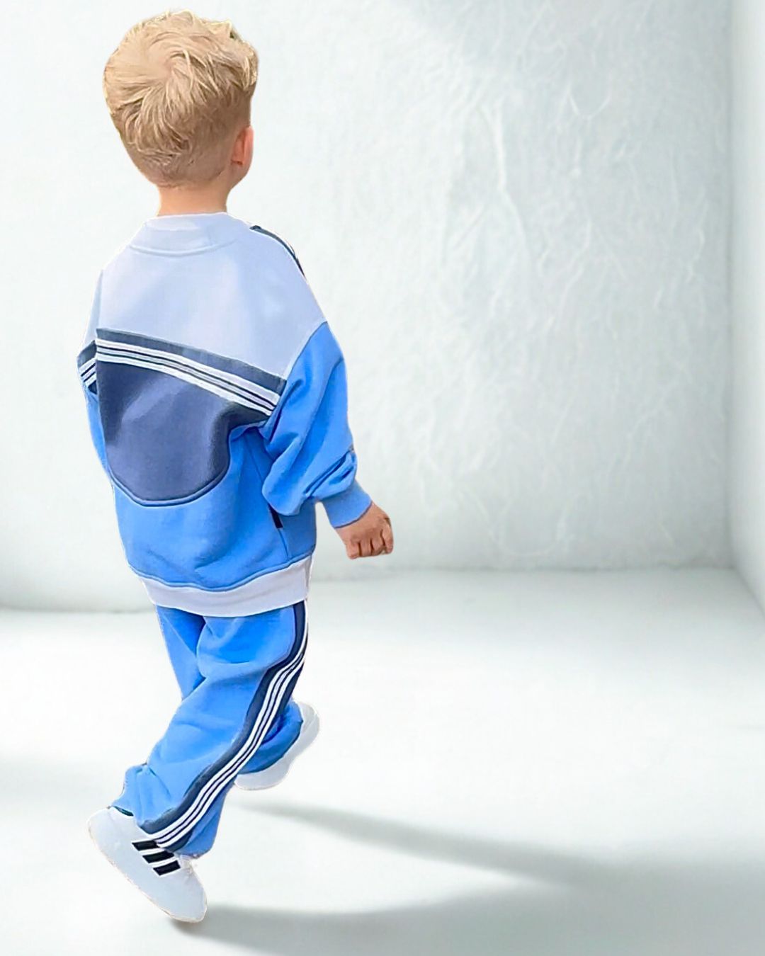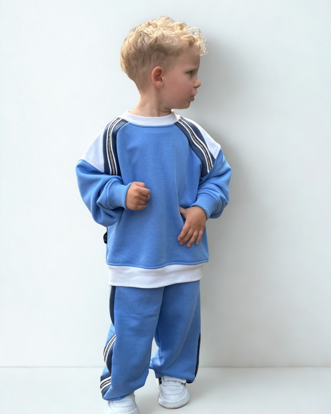 Tai lengvas ir stilingas vaikų kostiumėlis, įkvėptas gaivaus dangaus ir laisvės pojūčio! 💫 Šviesiai mėlyna spalva suteikia ramybės 💙, o kontrastingos tamsios detalės bei sportiškos juostelės ant rankovių ir kelnių šonų prideda energijos ir dinamikos ⚡️.