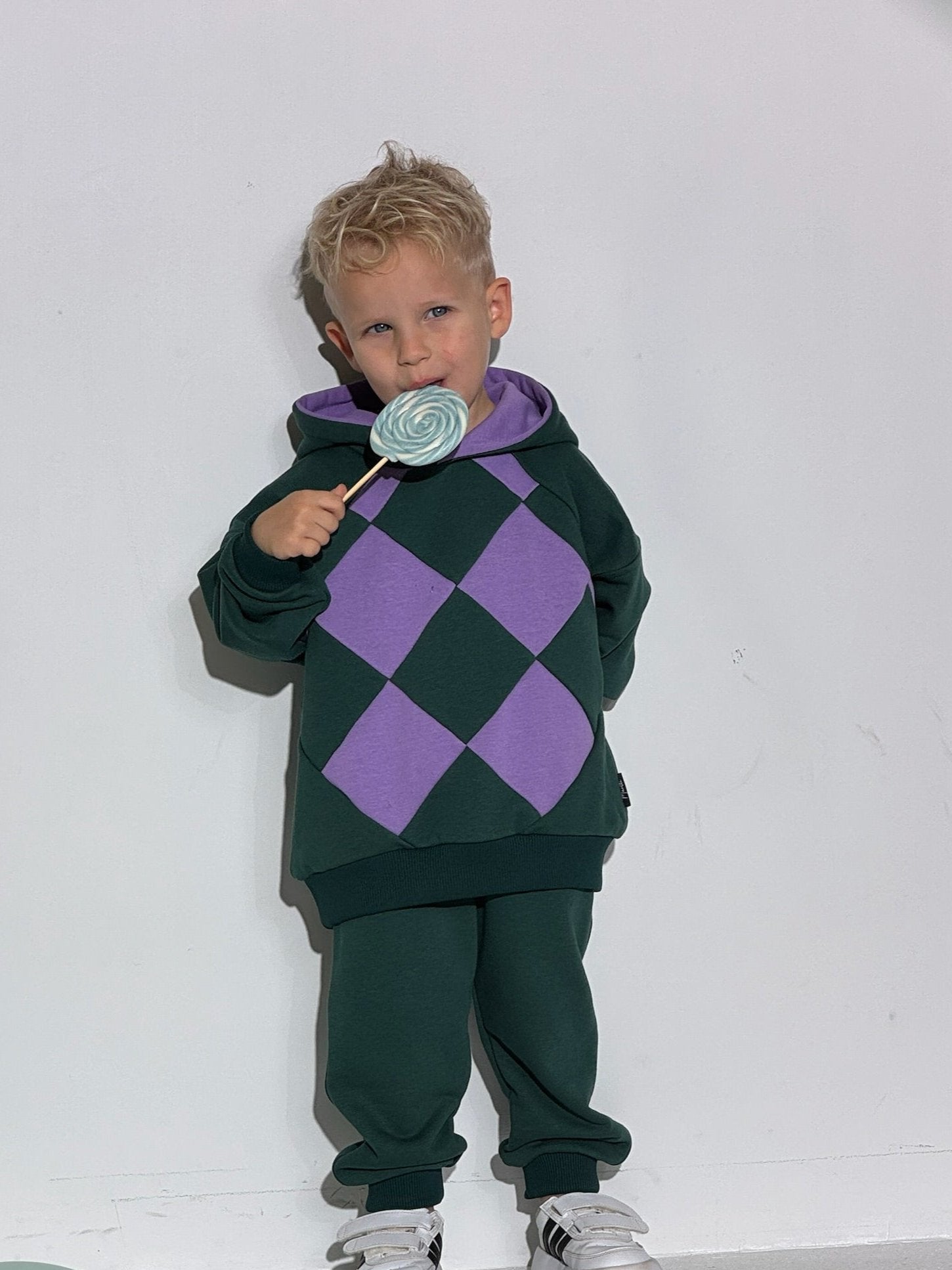 Tai ne tik kostiumėlis, bet ir mažo svajotojo pasaulio dalis. Sodri miško žaluma kviečia į gamtos paslaptis, o ryškūs levandų violetiniai rombai spindi tarsi žiedai pievoje, primindami vaikystės džiaugsmą ir nevaržomą kūrybiškumą.