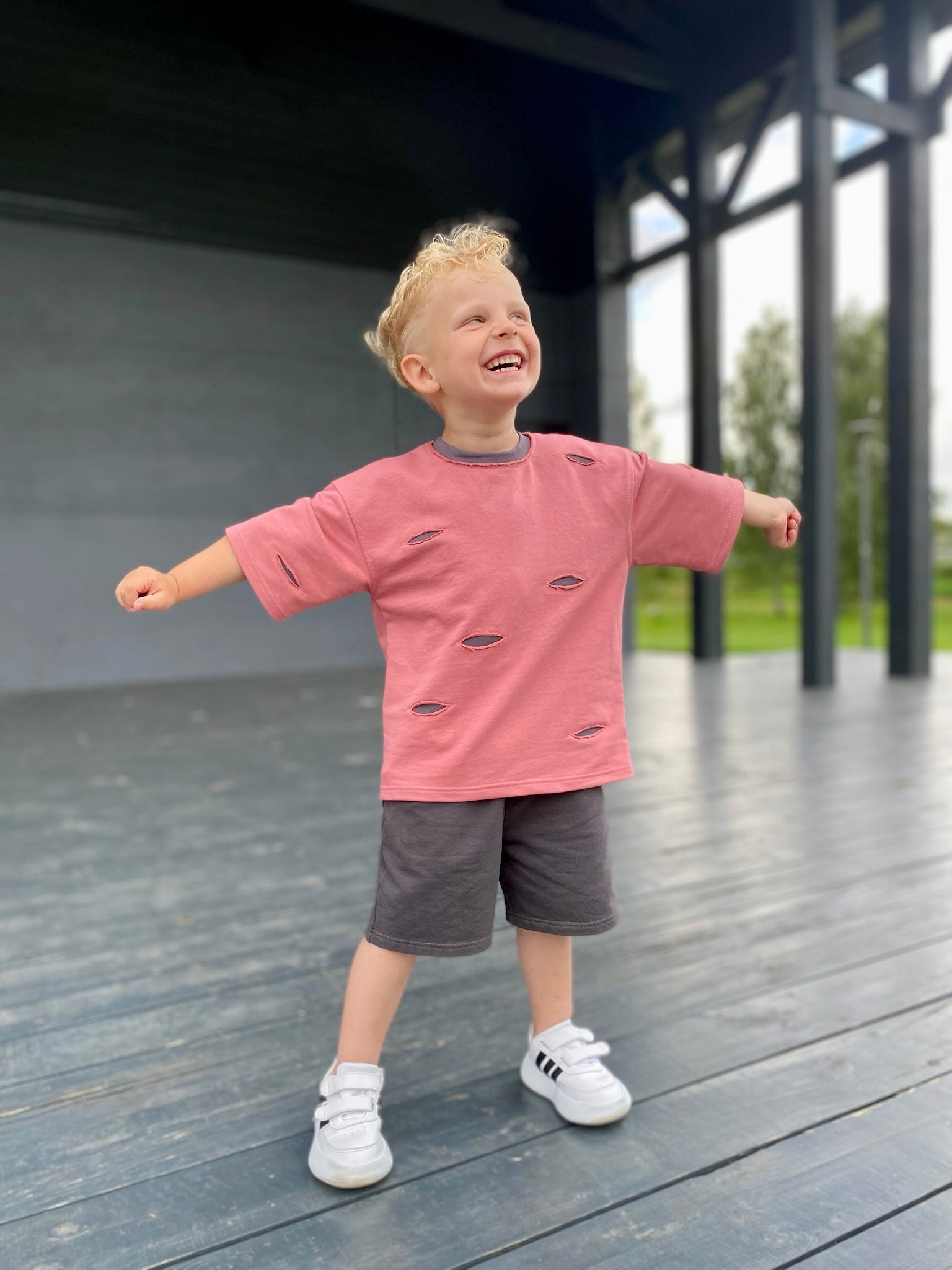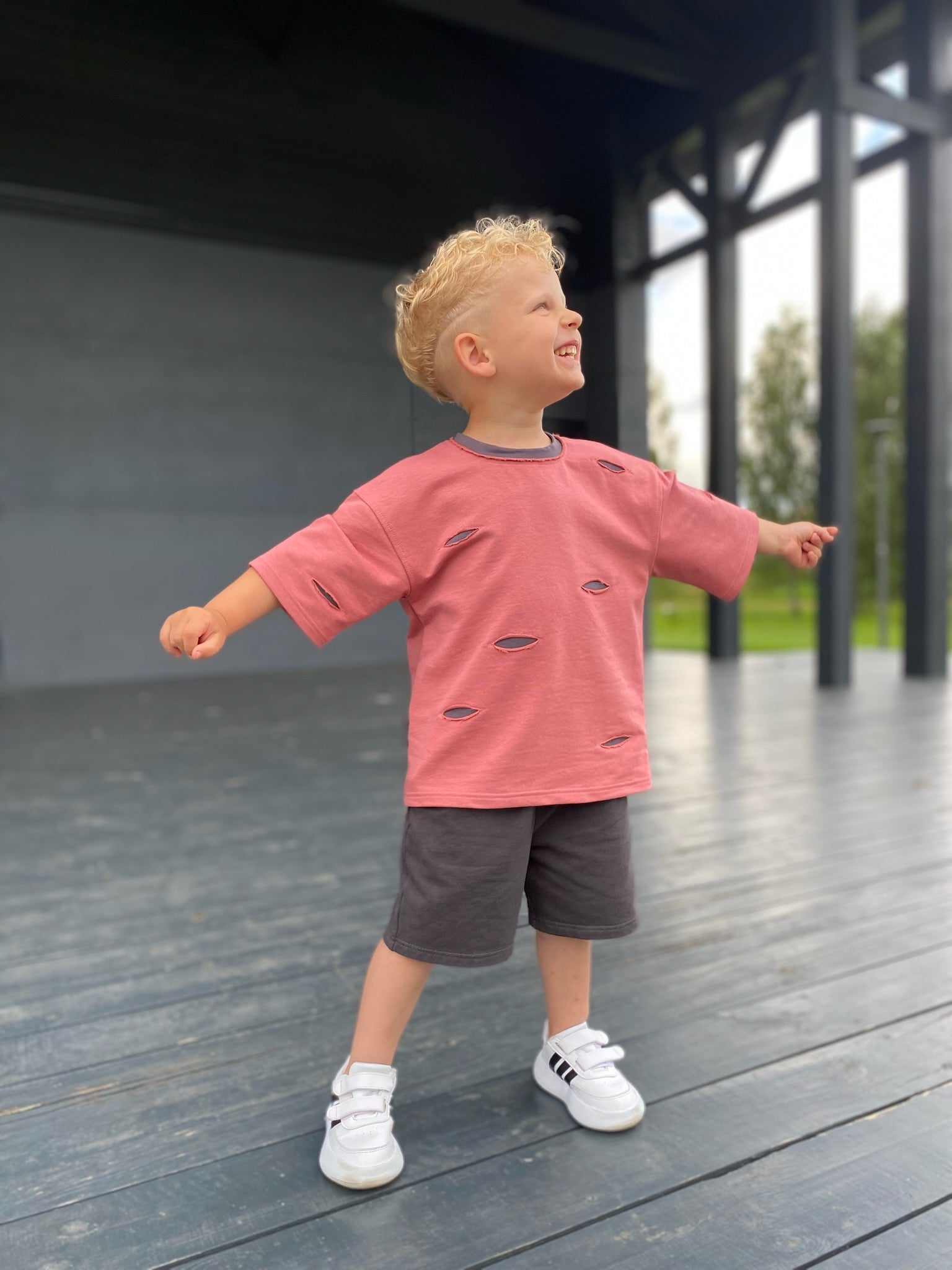 Šis vaikiškas kostiumėlis su stilingomis dekoratyvinėmis iškirpomis – tikra laisvės ir judėjimo išraiška! Patogūs pilki šortai ir laisvo kirpimo marškinėliai leidžia nevaržomai judėti ir jaustis patogiai visą dieną. Puikus pasirinkimas tiek aktyviems žaidimams lauke, tiek jaukioms dienoms namuose. 😊