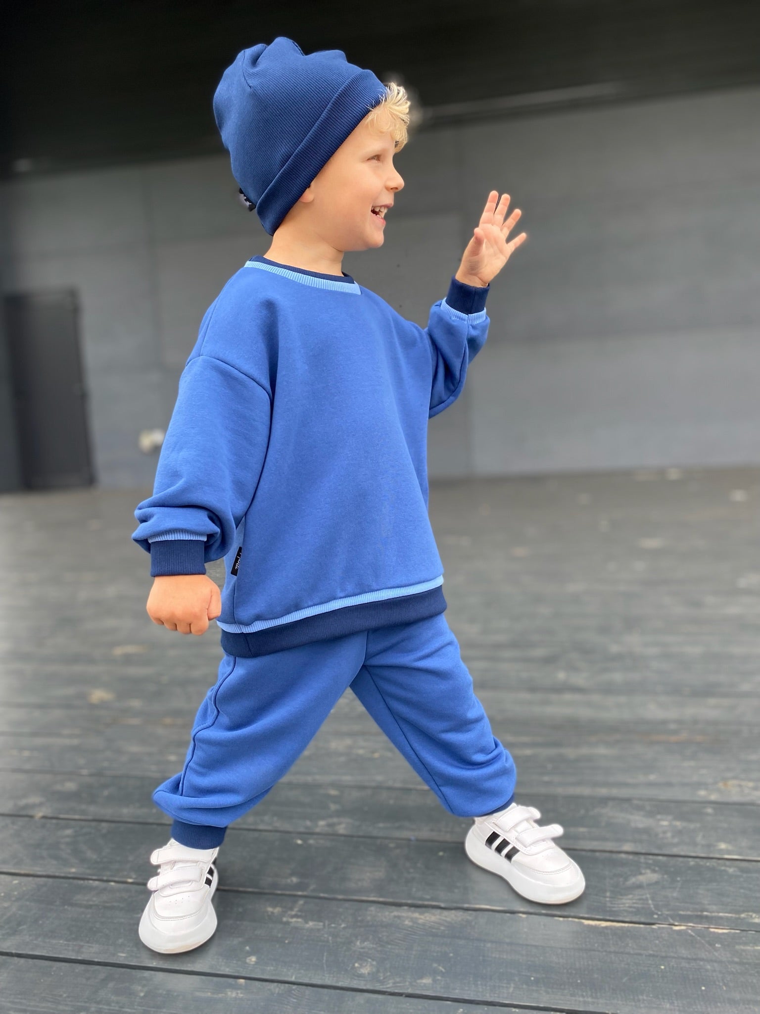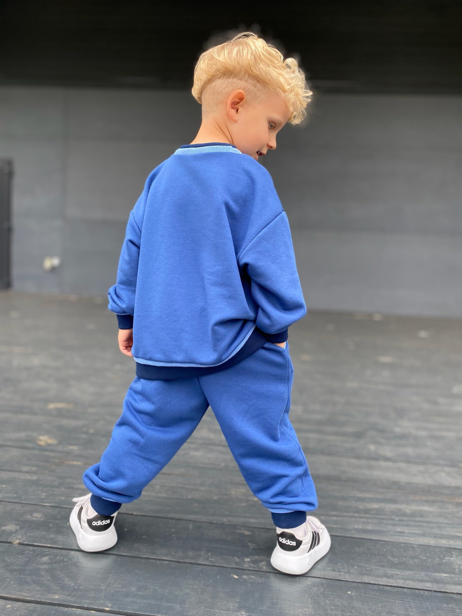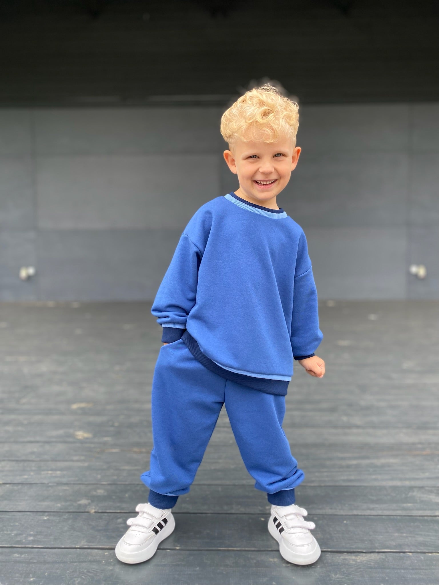 Šis linksmas ir patogus kostiumėlis – tobulas pasirinkimas aktyviam vaikui! Ryškiai mėlynas komplektas iš džemperio ir kelnių ne tik stilingas, bet ir labai patogus dėvėti kasdien. Tamprus, malonus audinys nevaržo judesių, o švelnus vidus šildo vėsesniu oru. Rankenų bei juosmens apdaila suteikia išskirtinumo ir užtikrina puikų prigludimą.