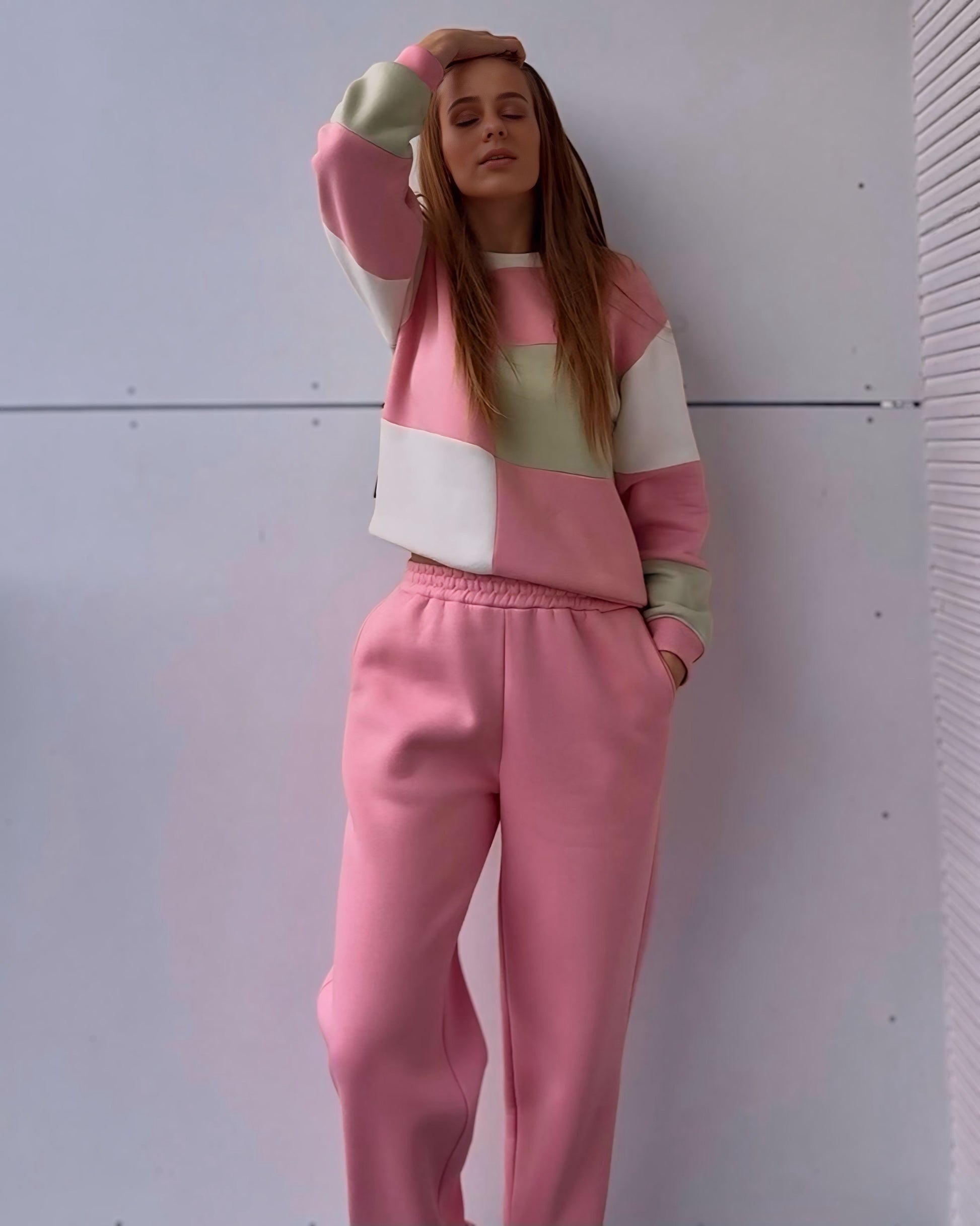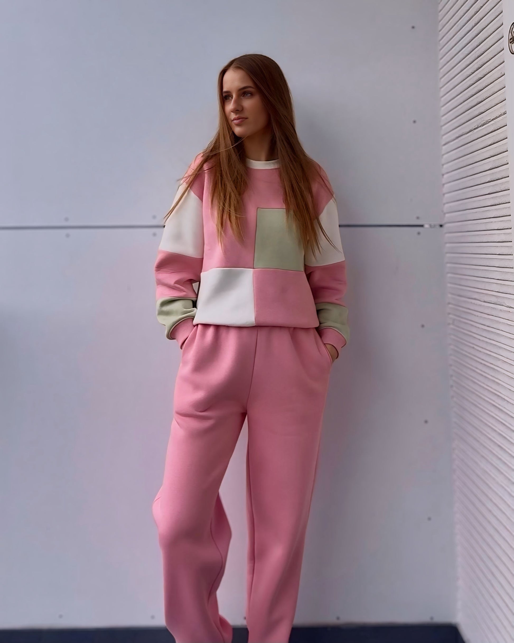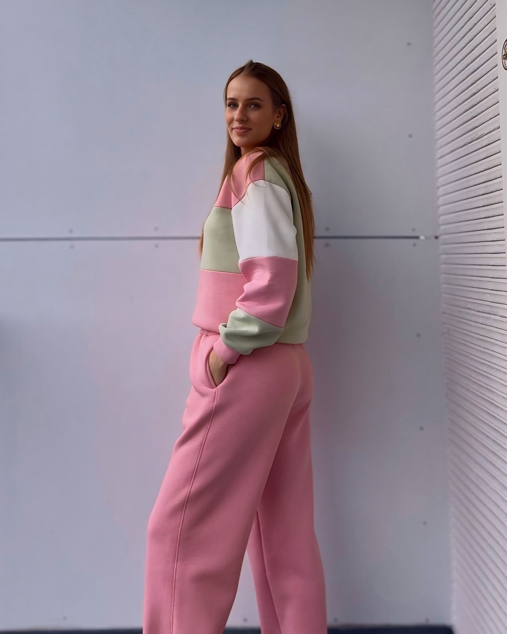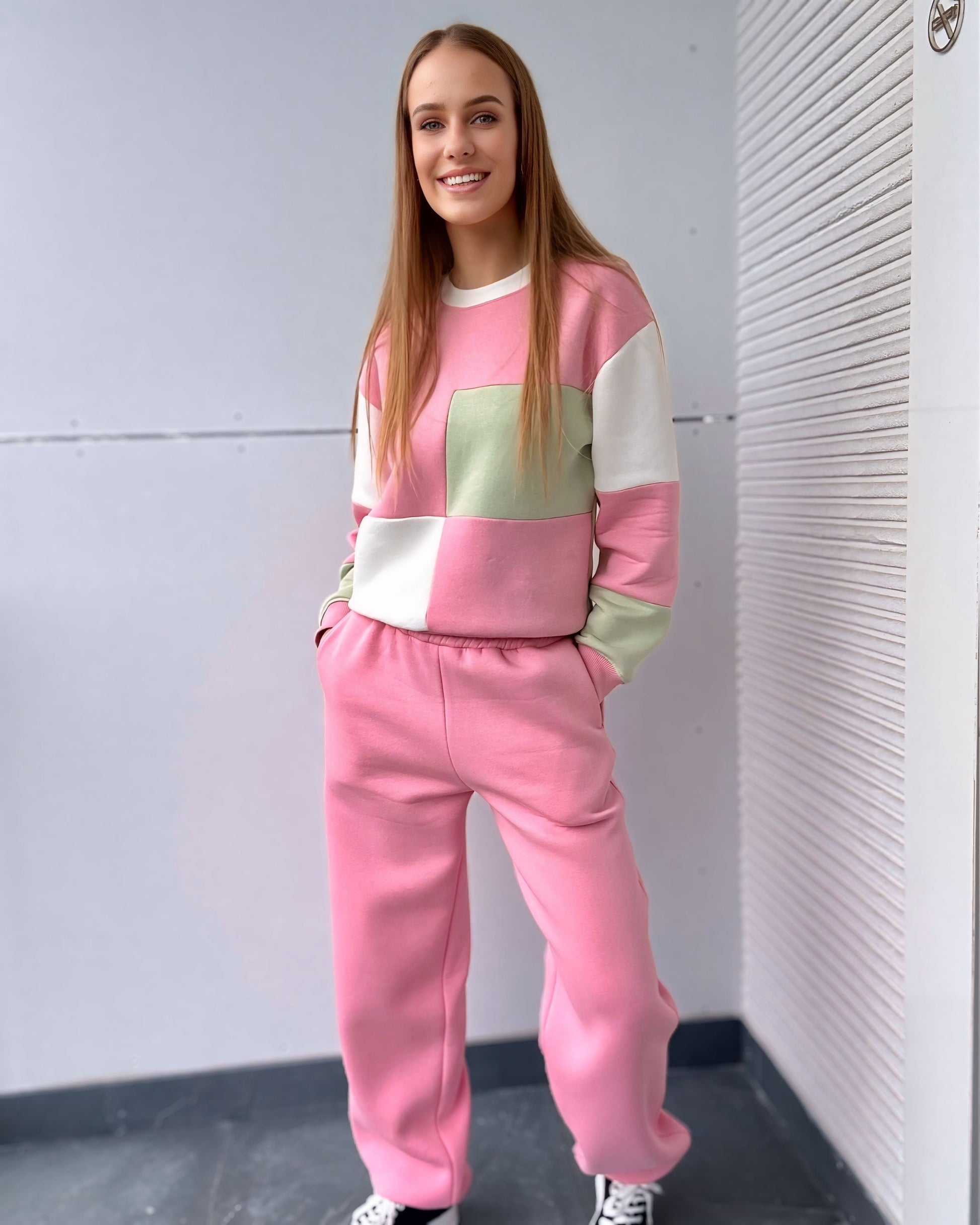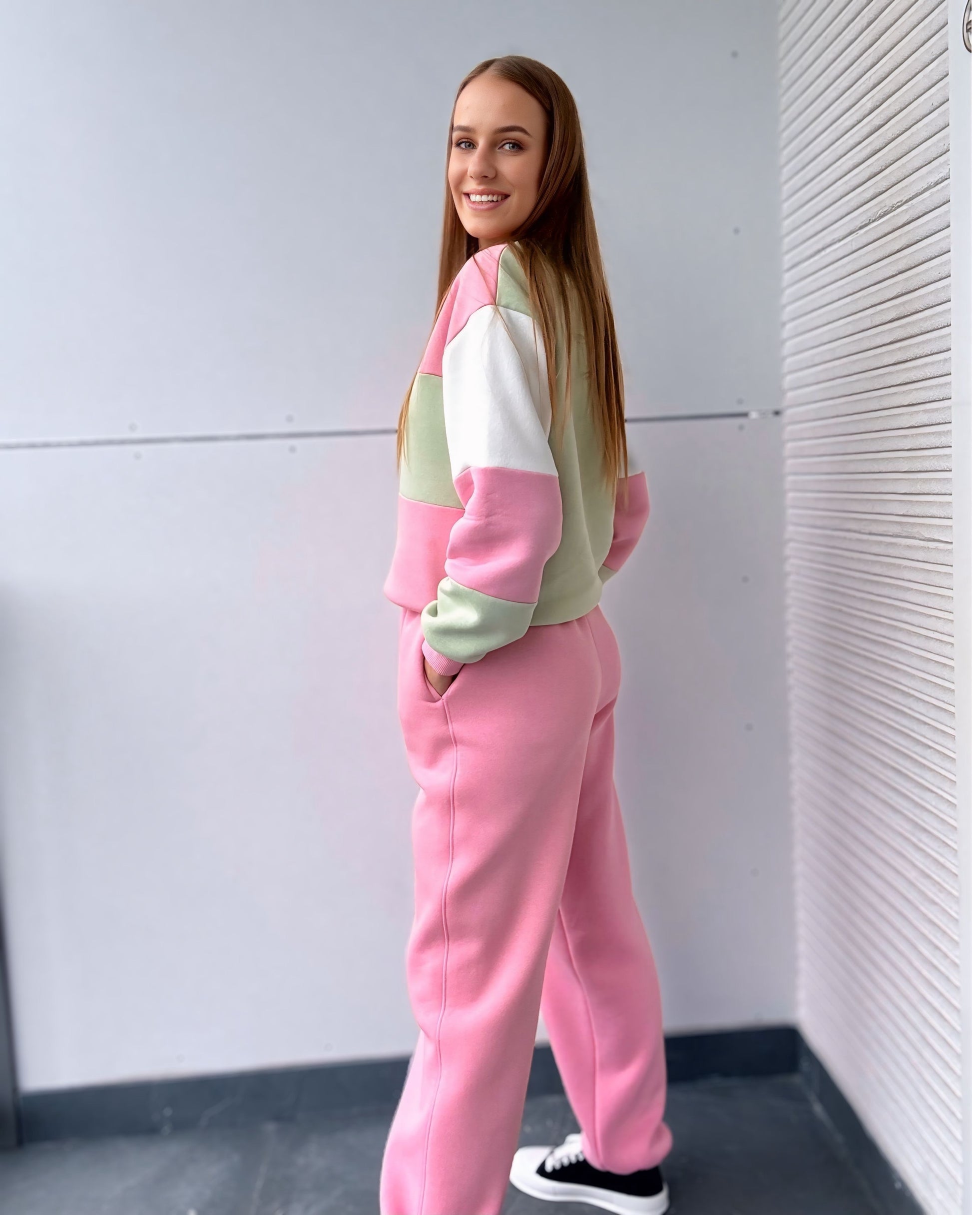 Pastelinės spalvos – rožinė, balta ir švelni pistacija – sukuria žaismingą, šviesų ir gaivų įvaizdį 💕 Patogus, nevaržantis judesių siluetas leis jaustis laisvai ir stilingai bet kurioje situacijoje!