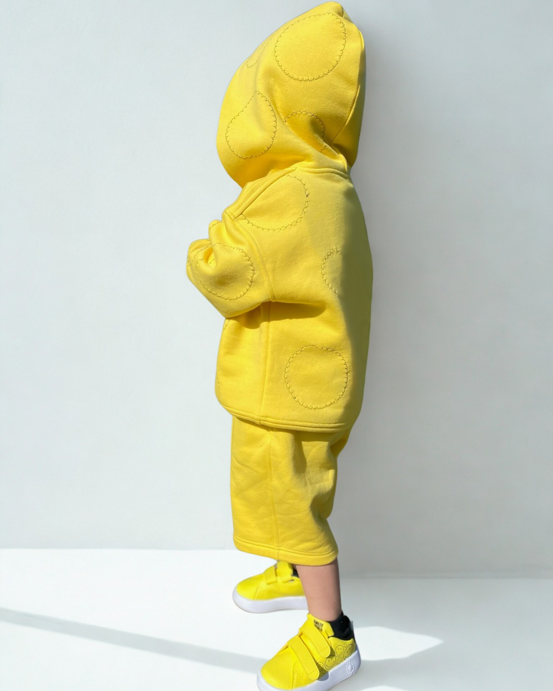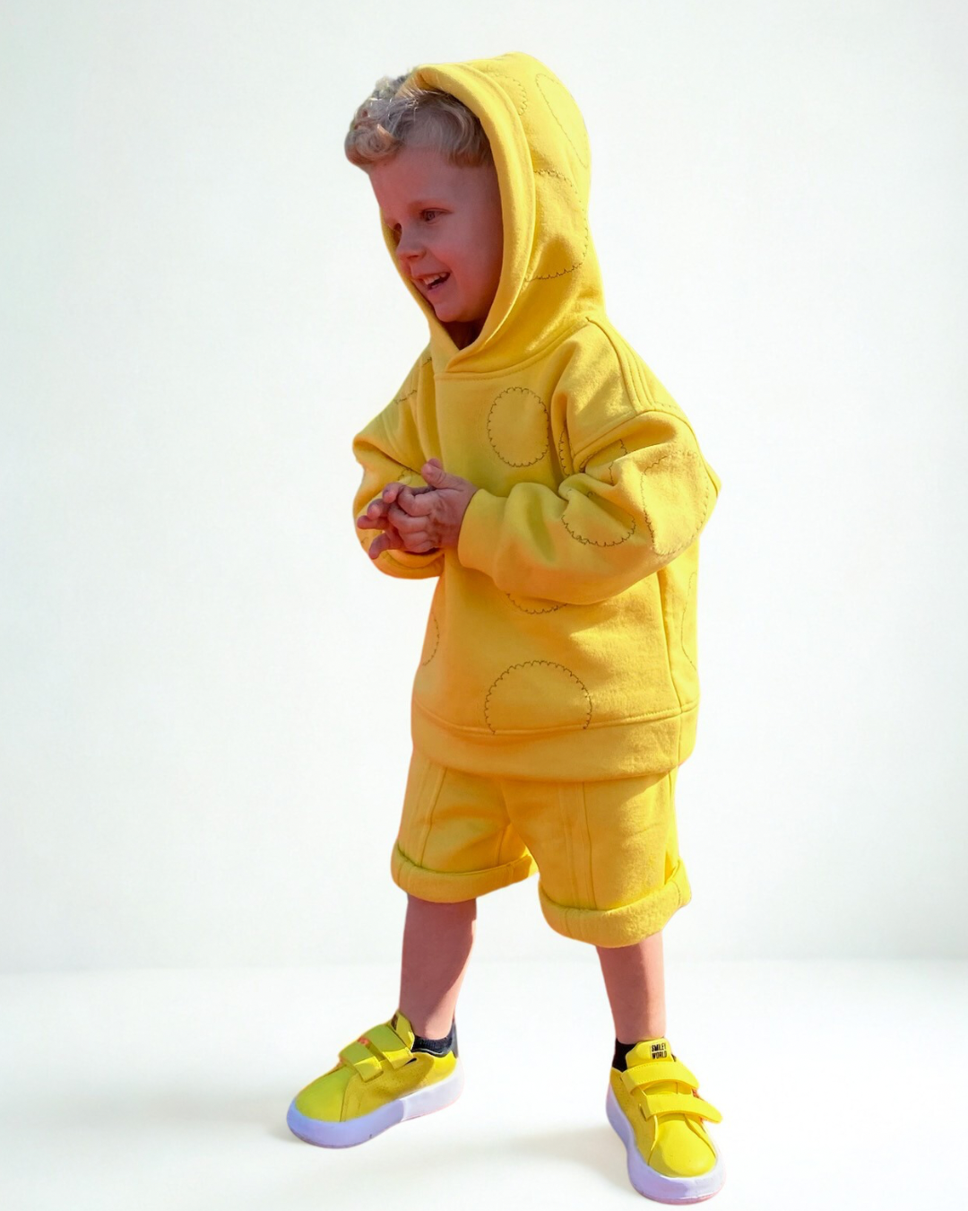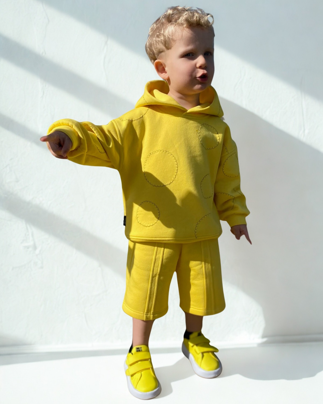 Ryškus ir žaismingas dviejų dalių kostiumėlis – švelnaus audinio džemperis su gobtuvu ir patogios šortų tipo kelnės. Idealus pasirinkimas šiltam pavasariui, vasarai ar aktyvioms lauko pramogoms!