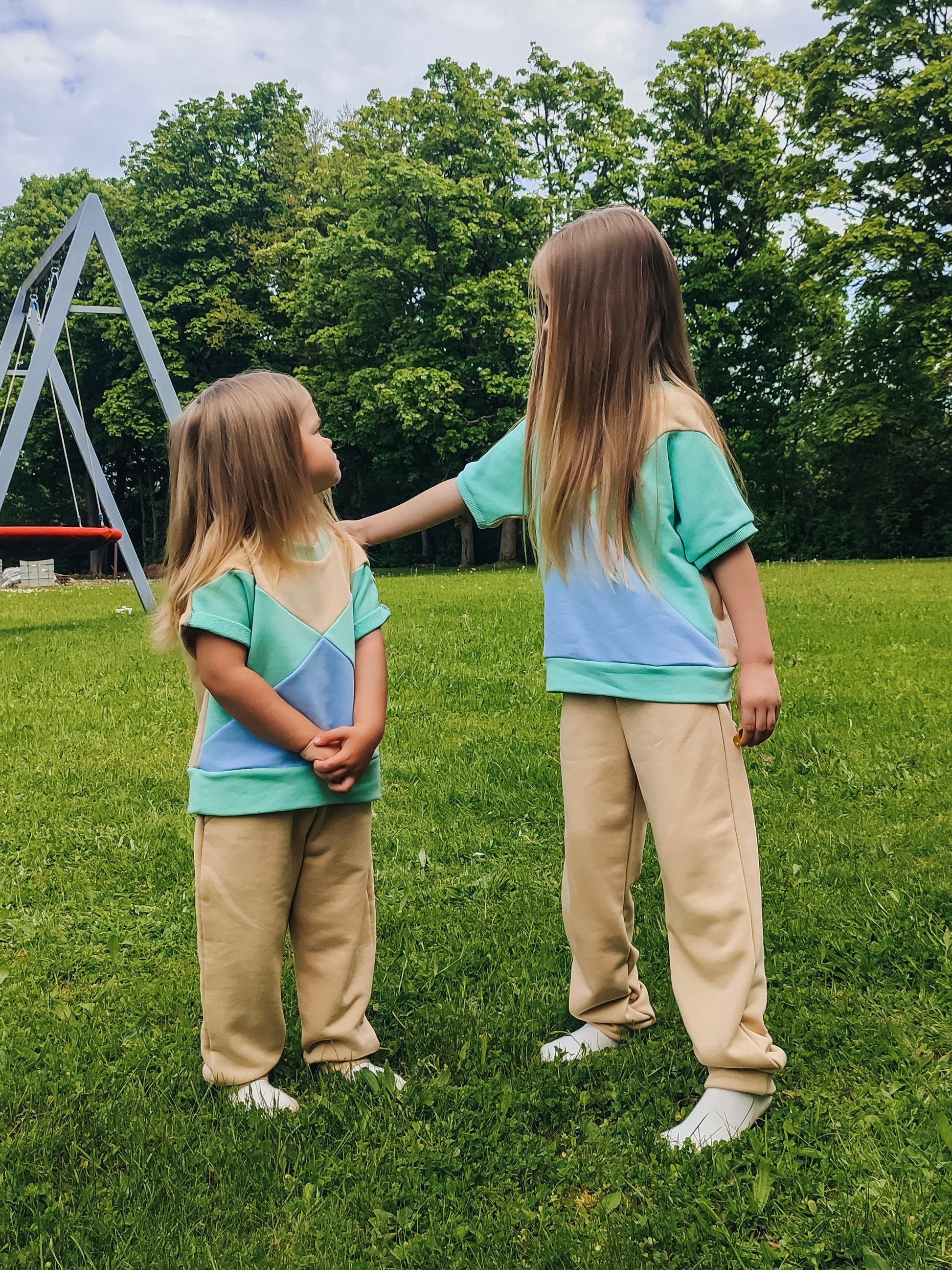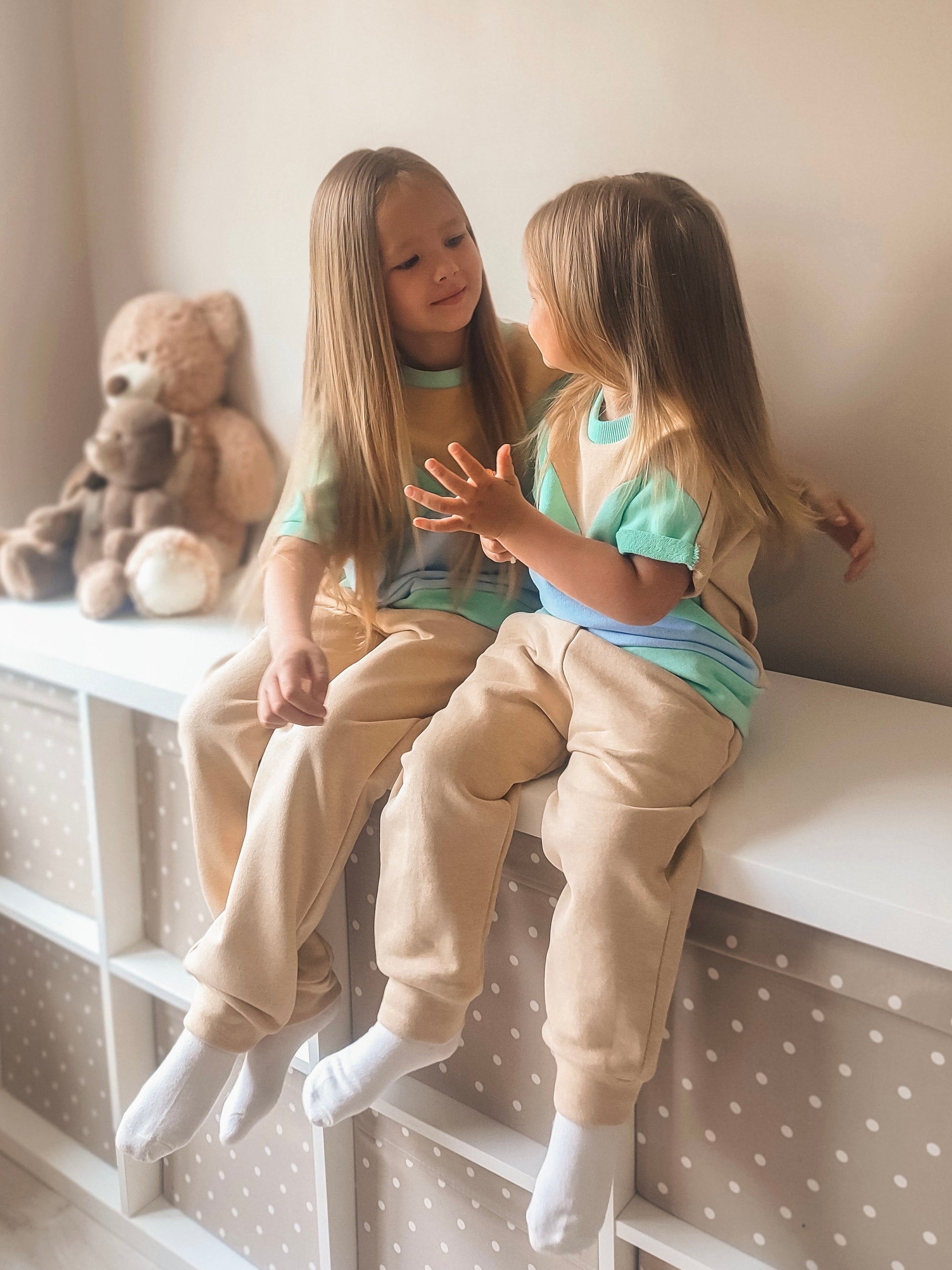Šis kostiumėlis ne tik patogus, bet ir pasiūtas iš minkšto, kvėpuojančio kilpinio trisiūlio trikotažo, kurio sudėtis yra 80% medvilnės ir 20% poliesterio. Spalvų pasirinkimas ne tik malonus akiai, bet ir turi tam tikrą prasmę: mėlyna spalva simbolizuoja ramybę, atsipalaidavimą ir pasitikėjimą, o šiltos smėlio spalvos tonai neša saugumo ir šilumos pojūtį.