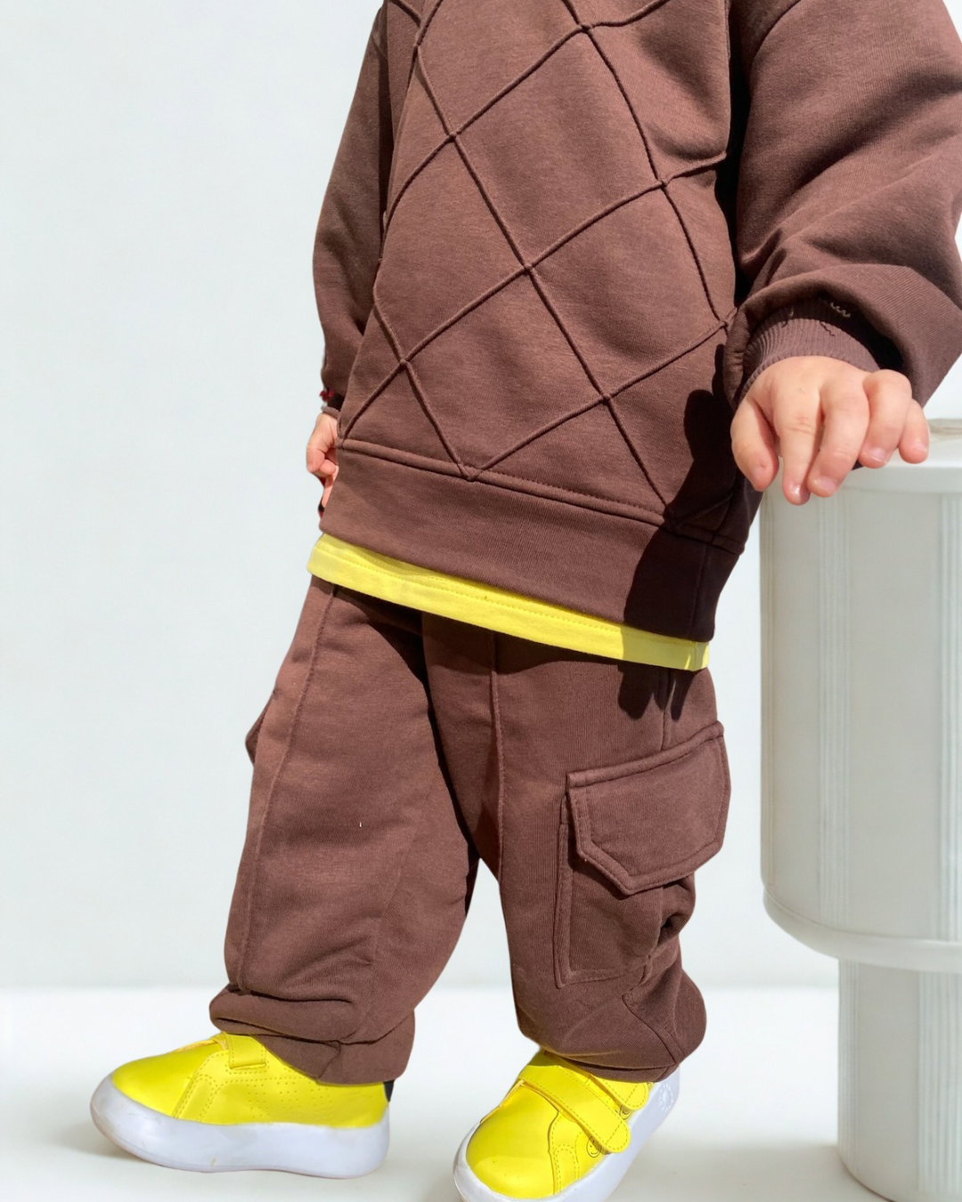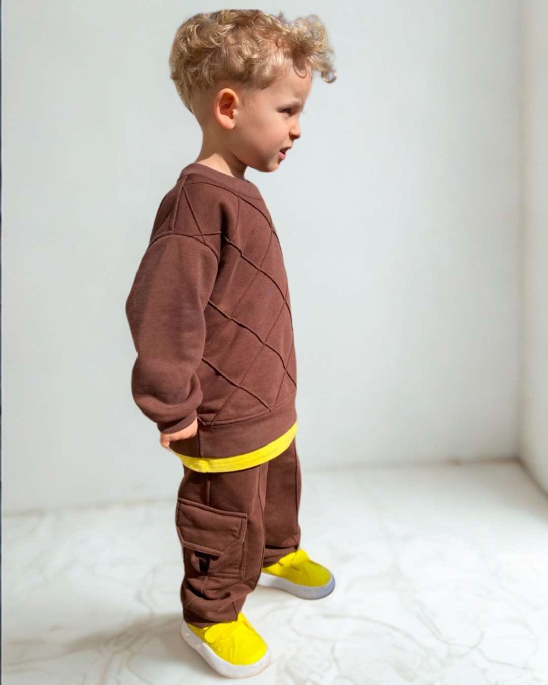 Kostiumėlis įkvėptas žemės tonų ramybės ir šilumos. Spalva simbolizuoja stabilumą, jaukumą ir artumą gamtai, o minimalistinis raštas suteikia subtilios elegancijos.