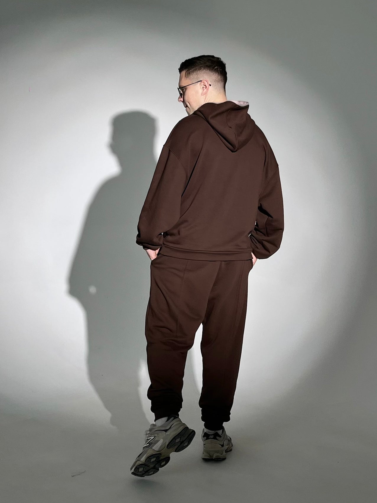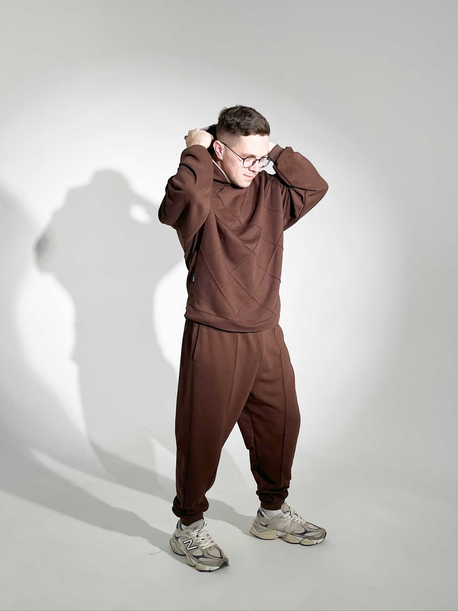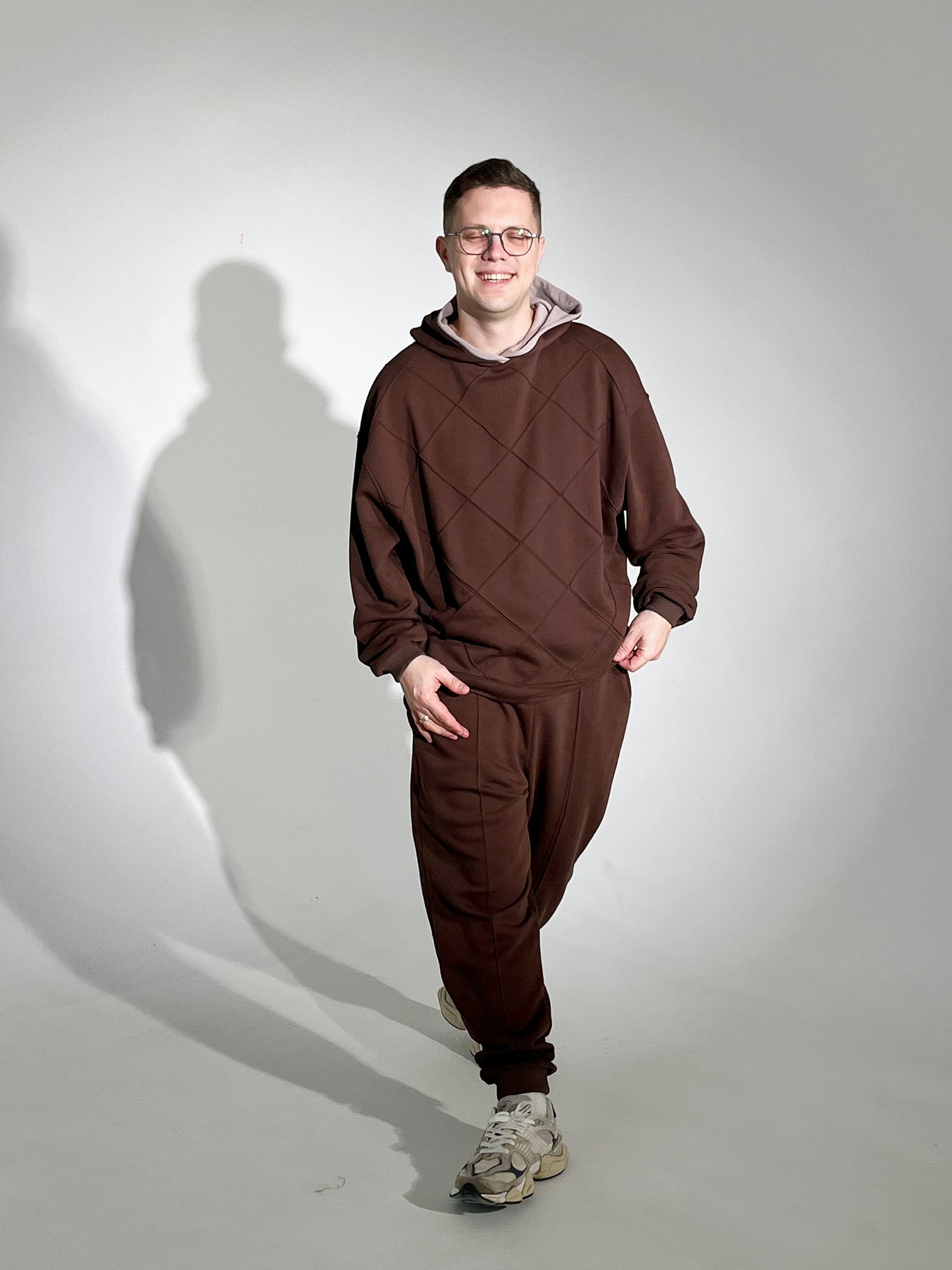 Minimalistinis, bet išskirtinis – šis vyriškas kostiumėlis sukurtas komfortui ir stiliui. Tamsiai ruda spalva suteikia solidumo, laisvo kirpimo džemperis su kapišonu ir subtilia dygsniuota tekstūra – tai klasika, kuri niekada neišeis iš mados. Kostiumėlio dizainas užtikrina patogumą visai dienai, nesvarbu, ar ilsiesi namuose, ar leidi laiką mieste.