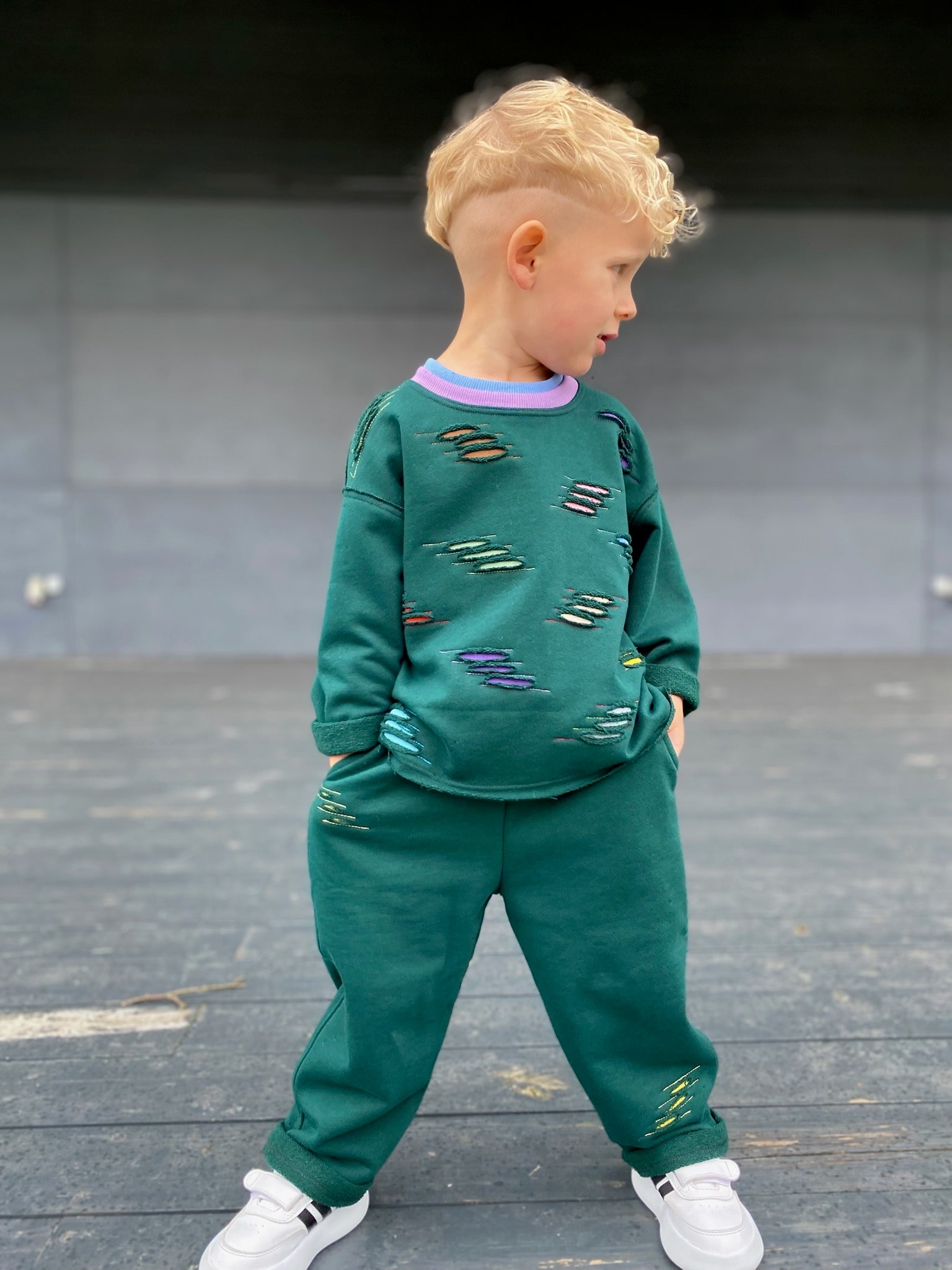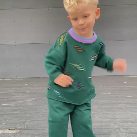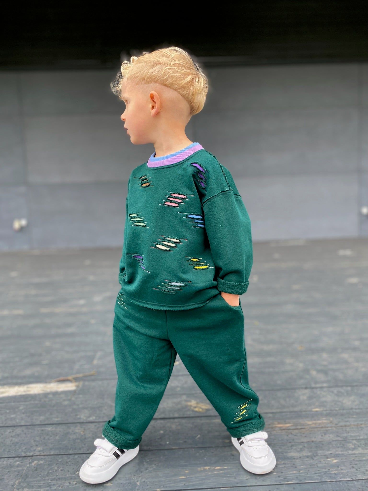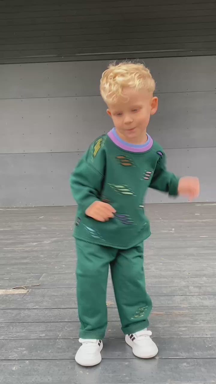 Kostiumėlis „Drąsa“ – tai ryškus ir žaismingas derinys vaikams, kurių kasdienybė kupina nuotykių! 💥 Išskirtinės spalvotos siuvinėjimo detalės primena spalvų pliūpsnius 🎨, o kontrastingas violetinis kakliukas suteikia išraiškingą akcentą 💜.