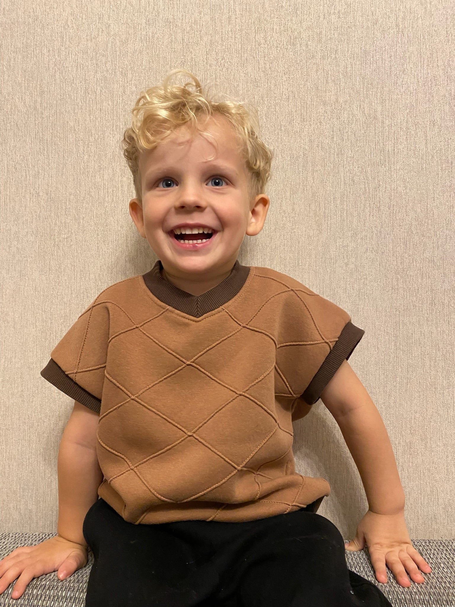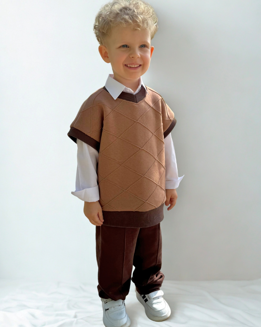 Stilinga ir jauki vaikiška liemenė – puikus pasirinkimas mažiesiems džentelmenams! ✨ Šią dailią trikotažinę liemenę galima dėvėti ir kaip marškinėlius, ir kaip stilingą akcentą ant marškinėlių, džemperiuko ar megztuko. Laisva, patogi, bet kartu elegantiška – tikras universalus drabužis! 🤎